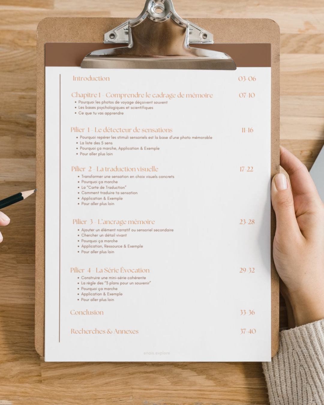 Le Cadrage de Mémoire est un ebook sans blabla, avec des solutions concrètes pour capturer l’âme de tes voyages,
